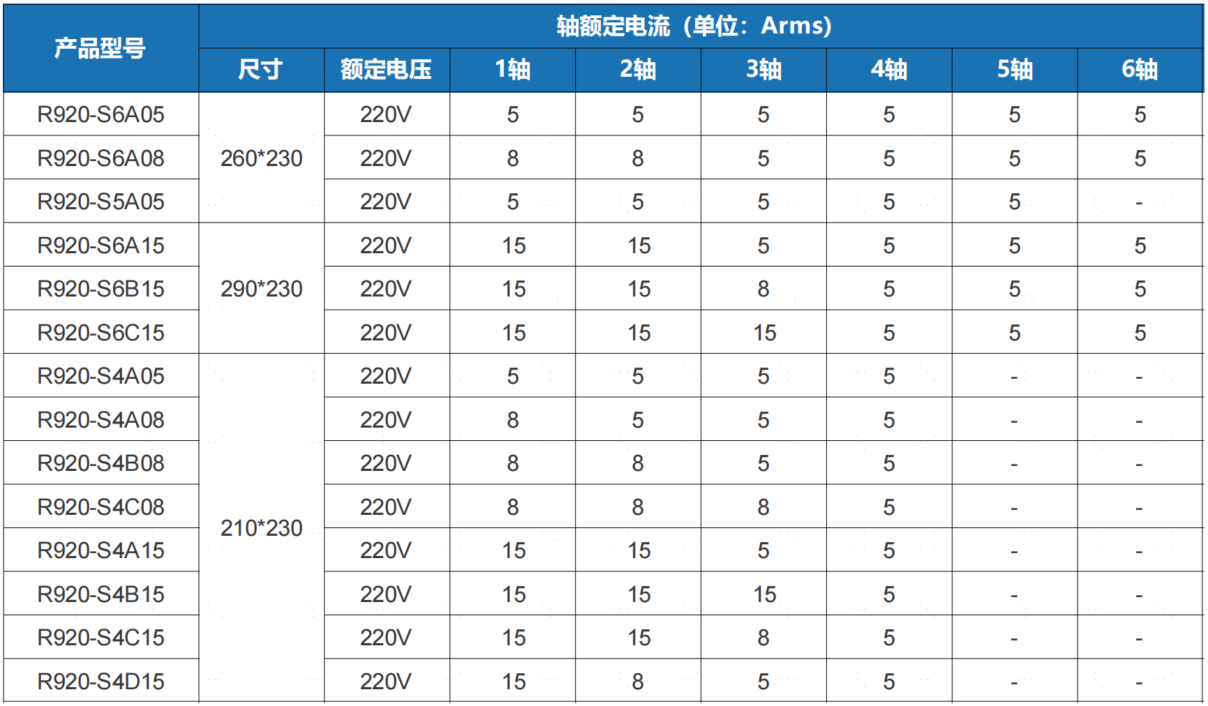 R920-S系列机器人专用伺服驱动器是一款针对机器人全场景设计的高性能多轴一体机,相比多轴模块化伺服驱动器,结构上更小巧紧凑,6轴一体伺服仅为一张A4纸大小(以6轴750W为例),机型功率组合丰富,可覆盖1.5kg~1500kg机器人需求,支持SCARA、Delta、四轴码垛、六关节等多种机器人类型,支持主流的EtherCAT通讯协议,广泛适用于各种机器人总线应用场合。